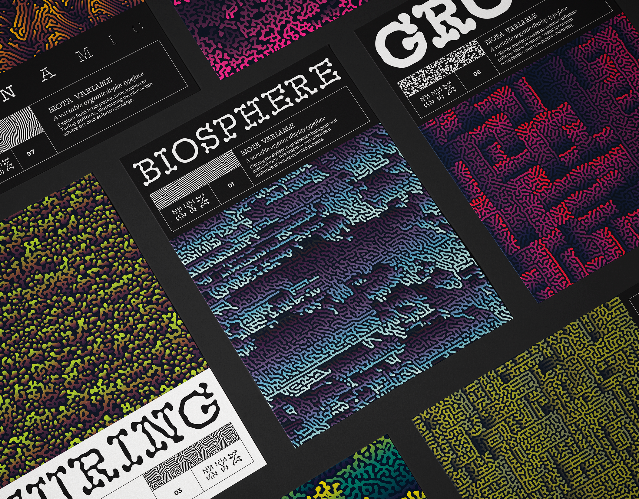 Variable display typeface inspired by reaction-diffusion patterns, combining science and design.
