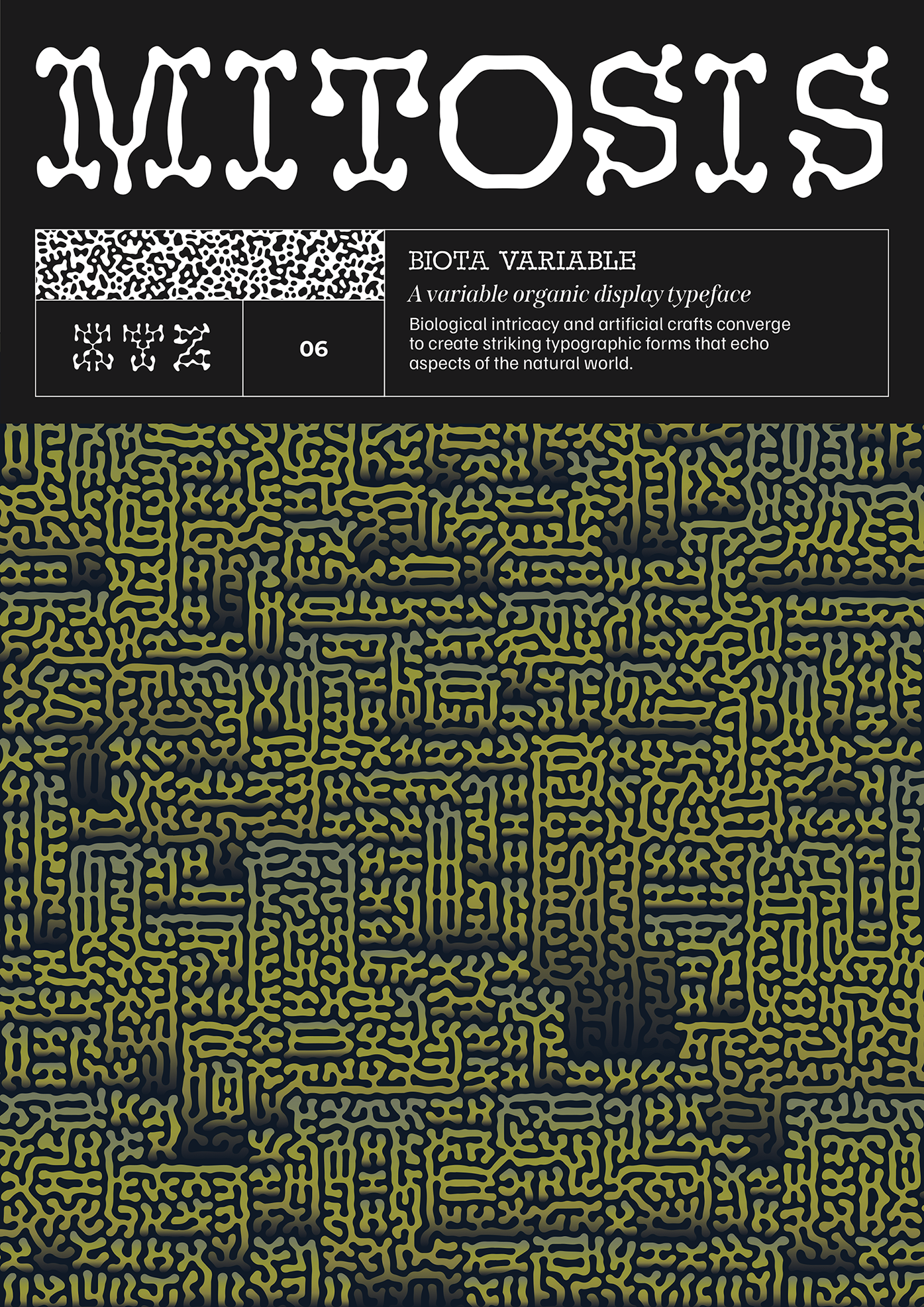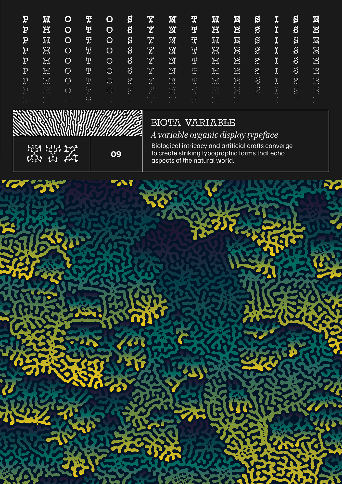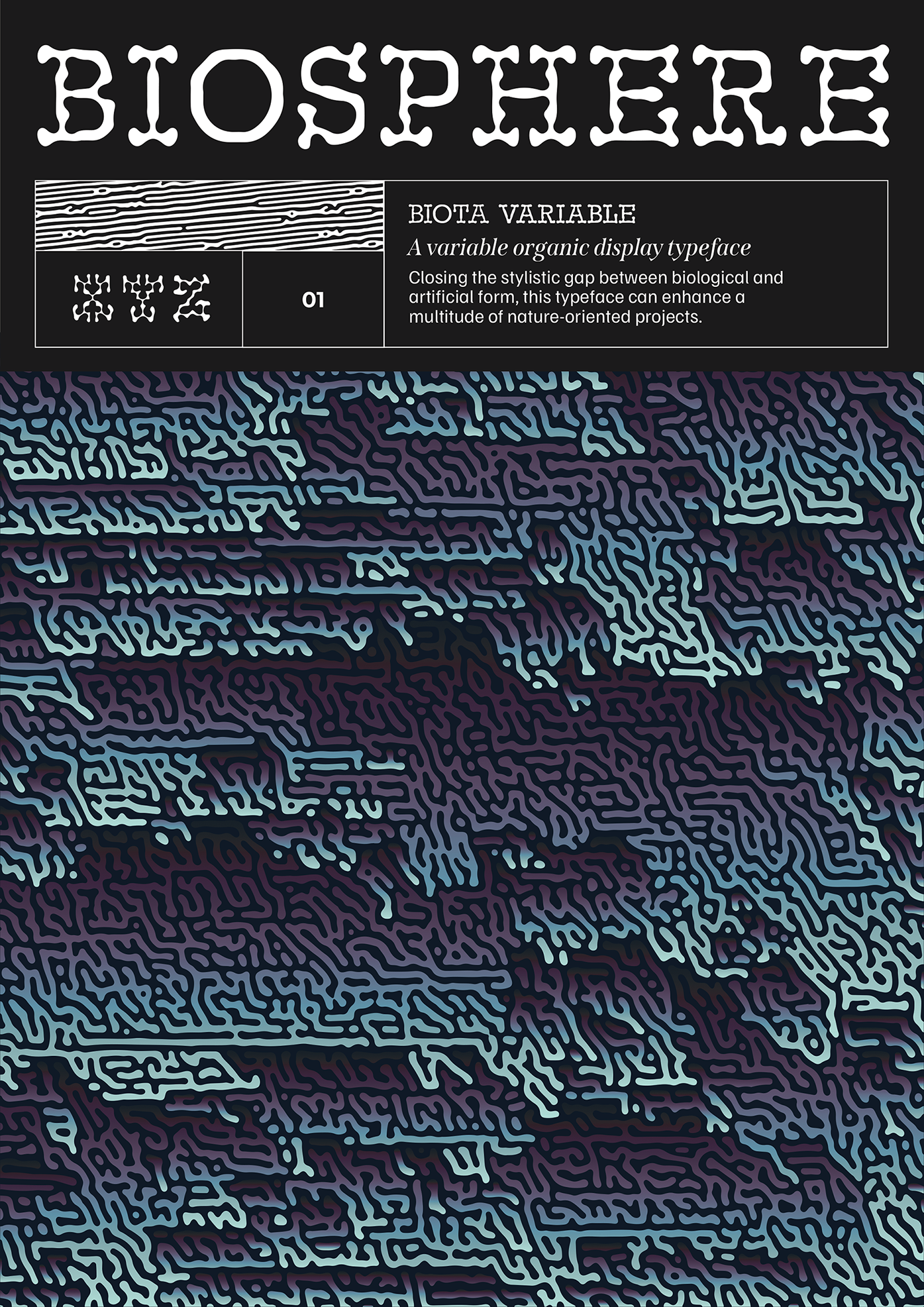 The typeface is supported by a comprehensive visual system demonstrated in a set of 10 posters. These elements work together to illustrate how typographic forms can emerge naturally, reinforcing the project's conceptual foundation. Biota is particularly suited to work that intersects with biology, generative design, or typographic experimentation.