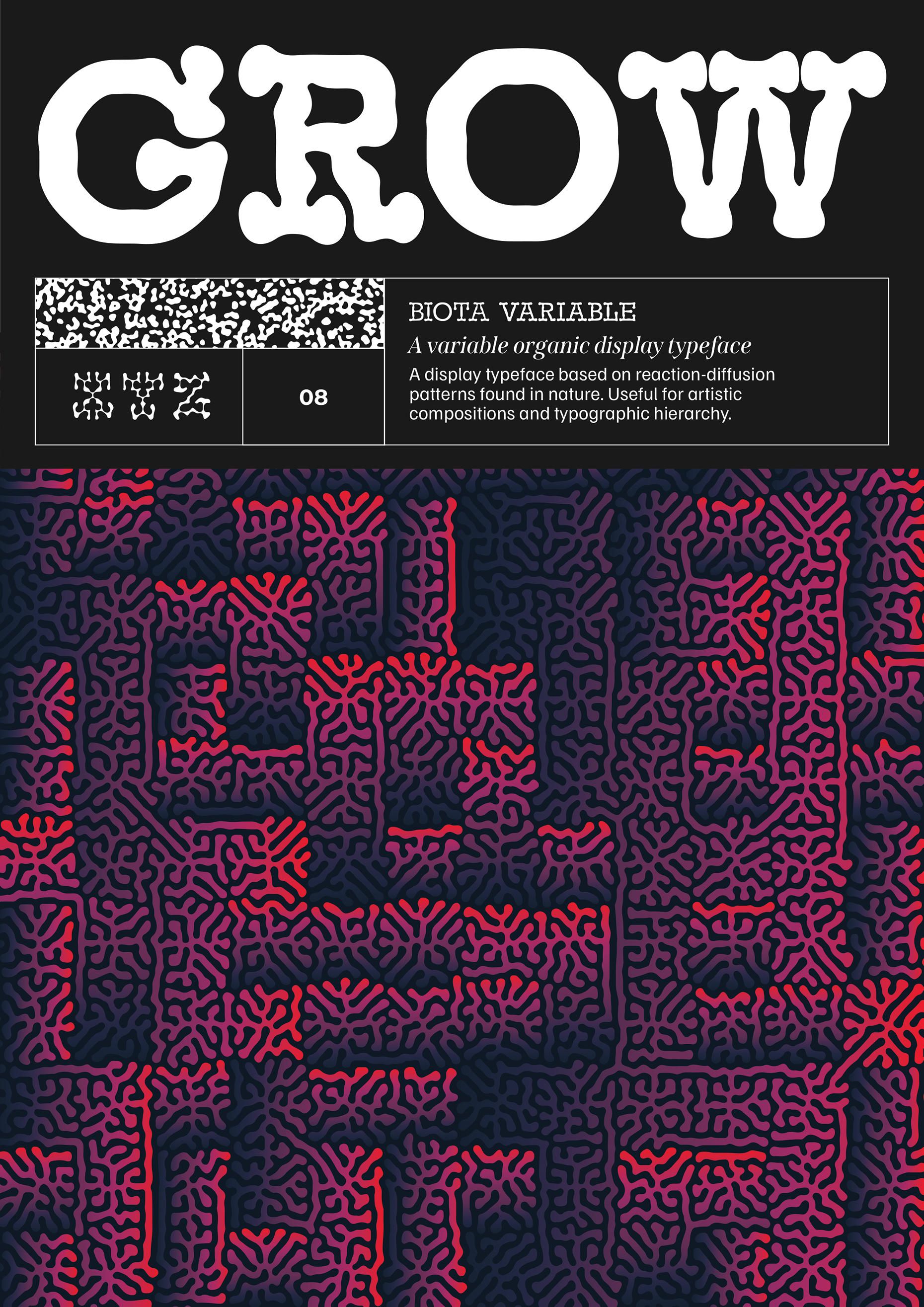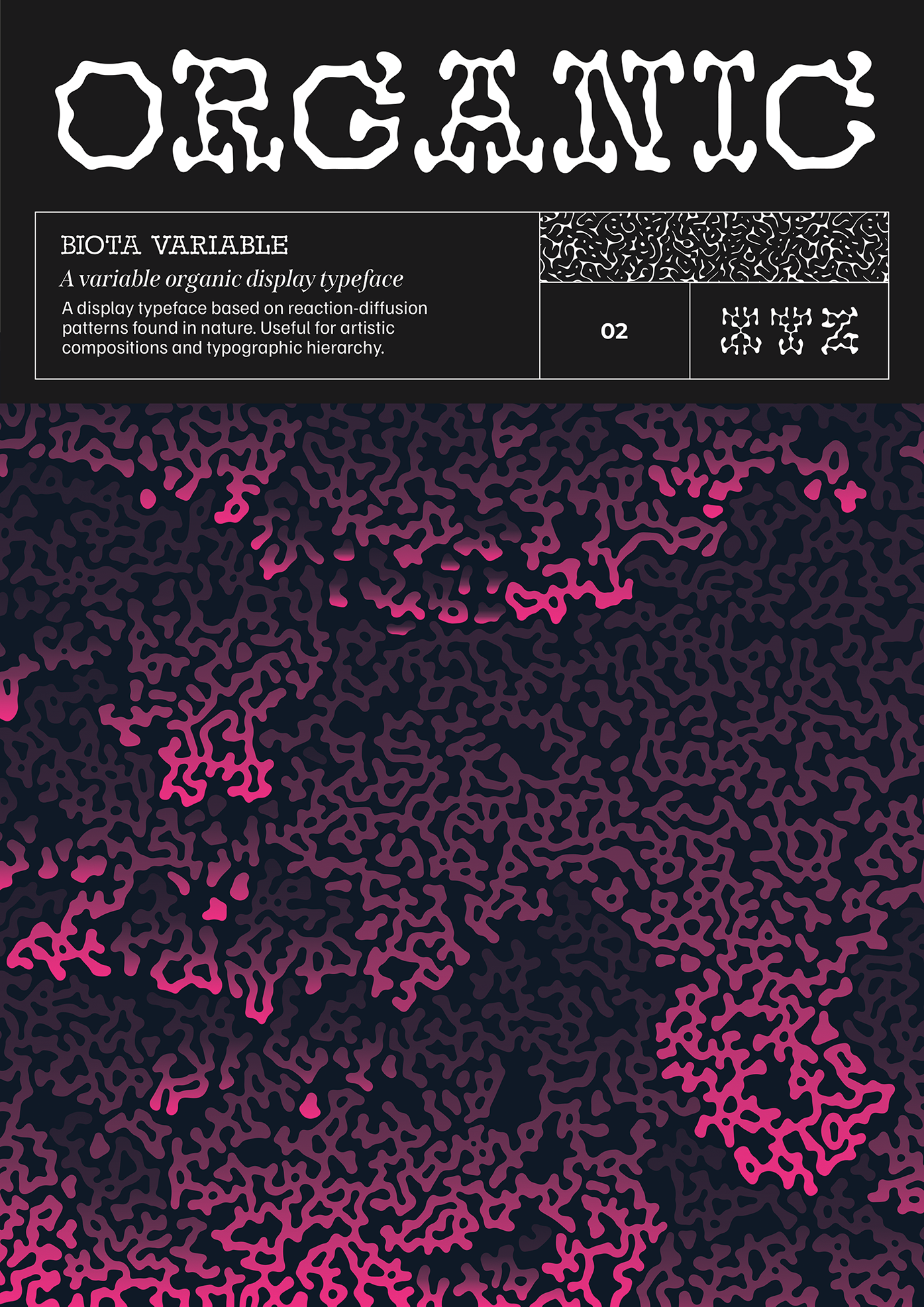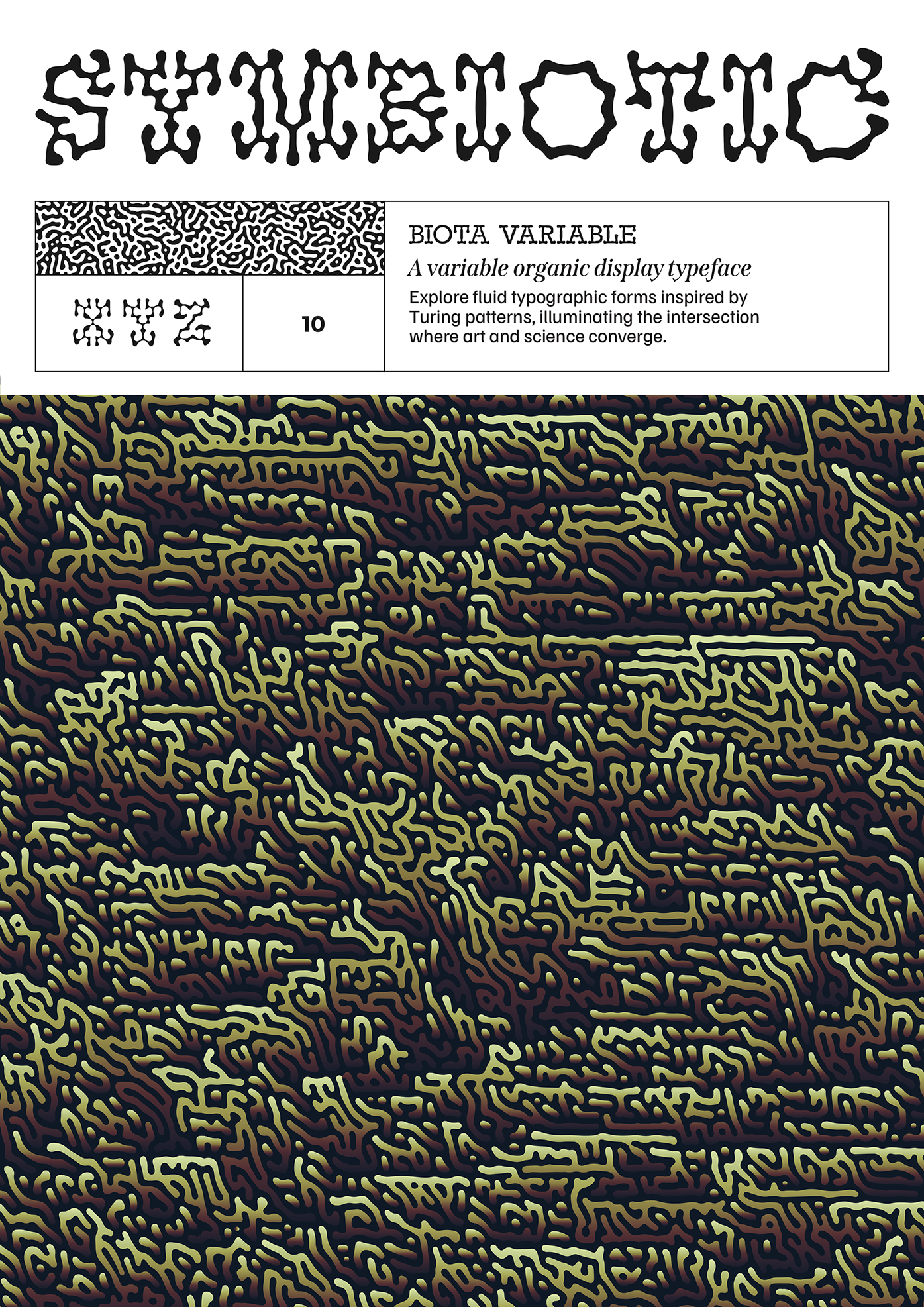The typeface is supported by a comprehensive visual system demonstrated in a set of 10 posters. These elements work together to illustrate how typographic forms can emerge naturally, reinforcing the project's conceptual foundation. Biota is particularly suited to work that intersects with biology, generative design, or typographic experimentation.