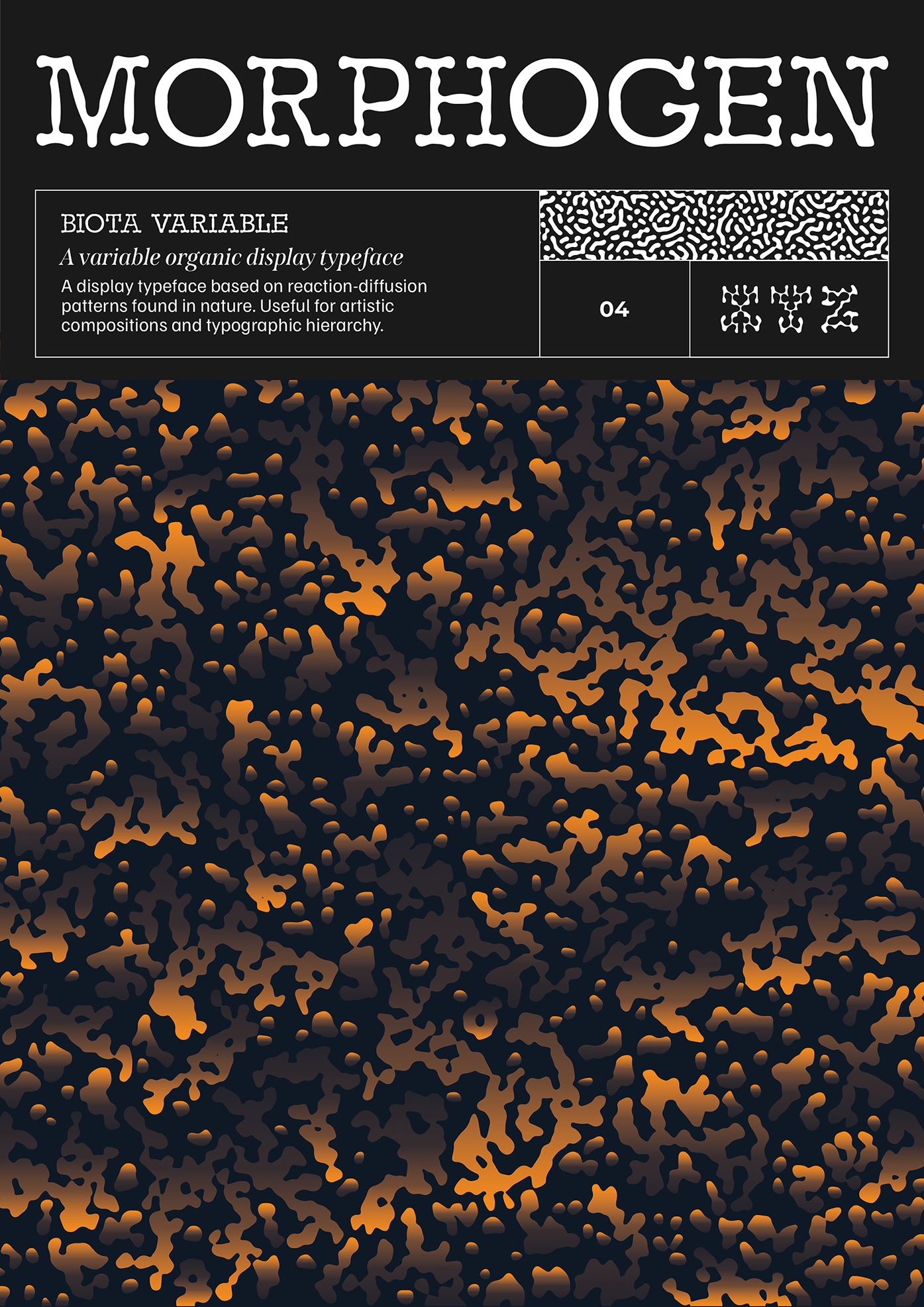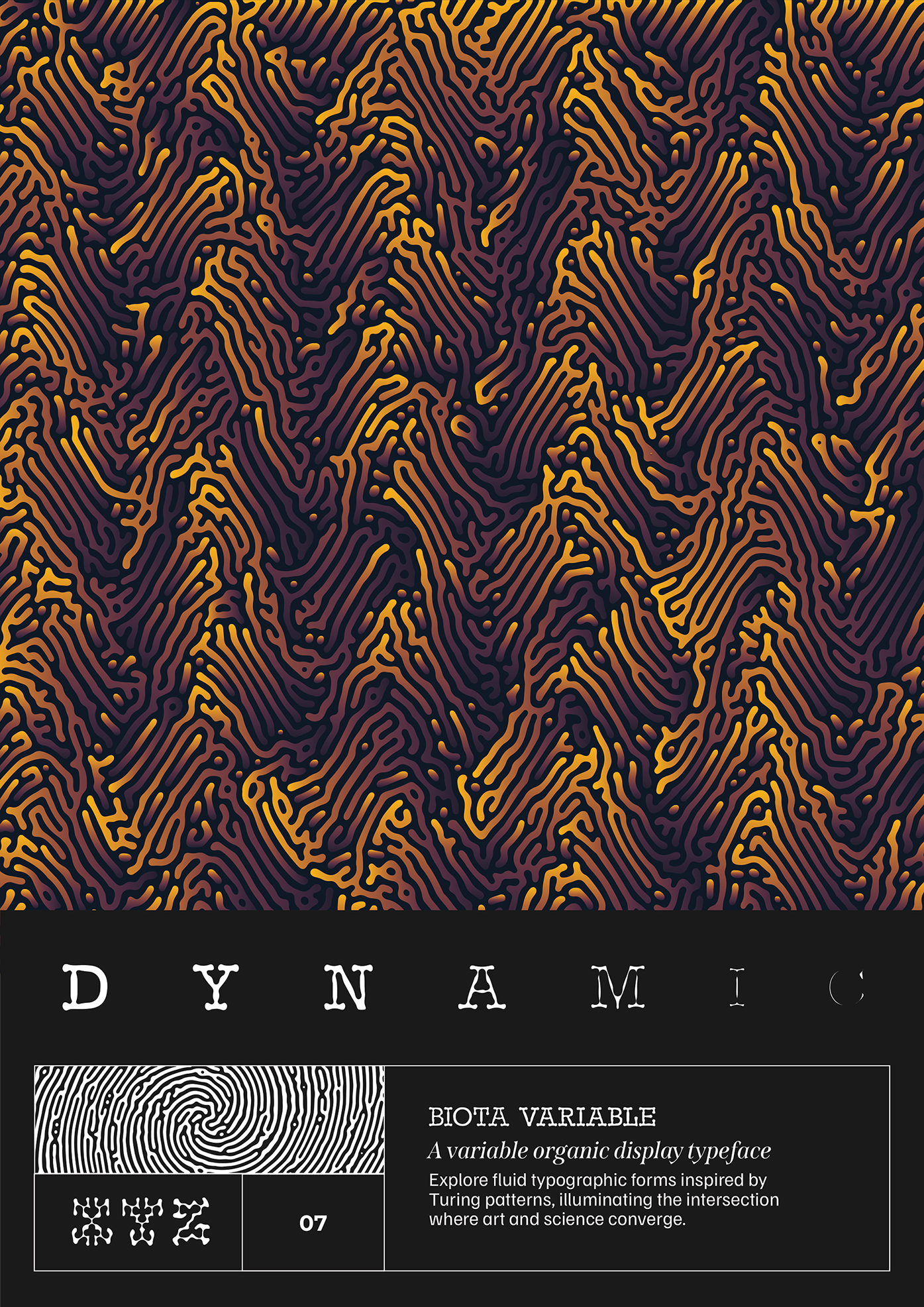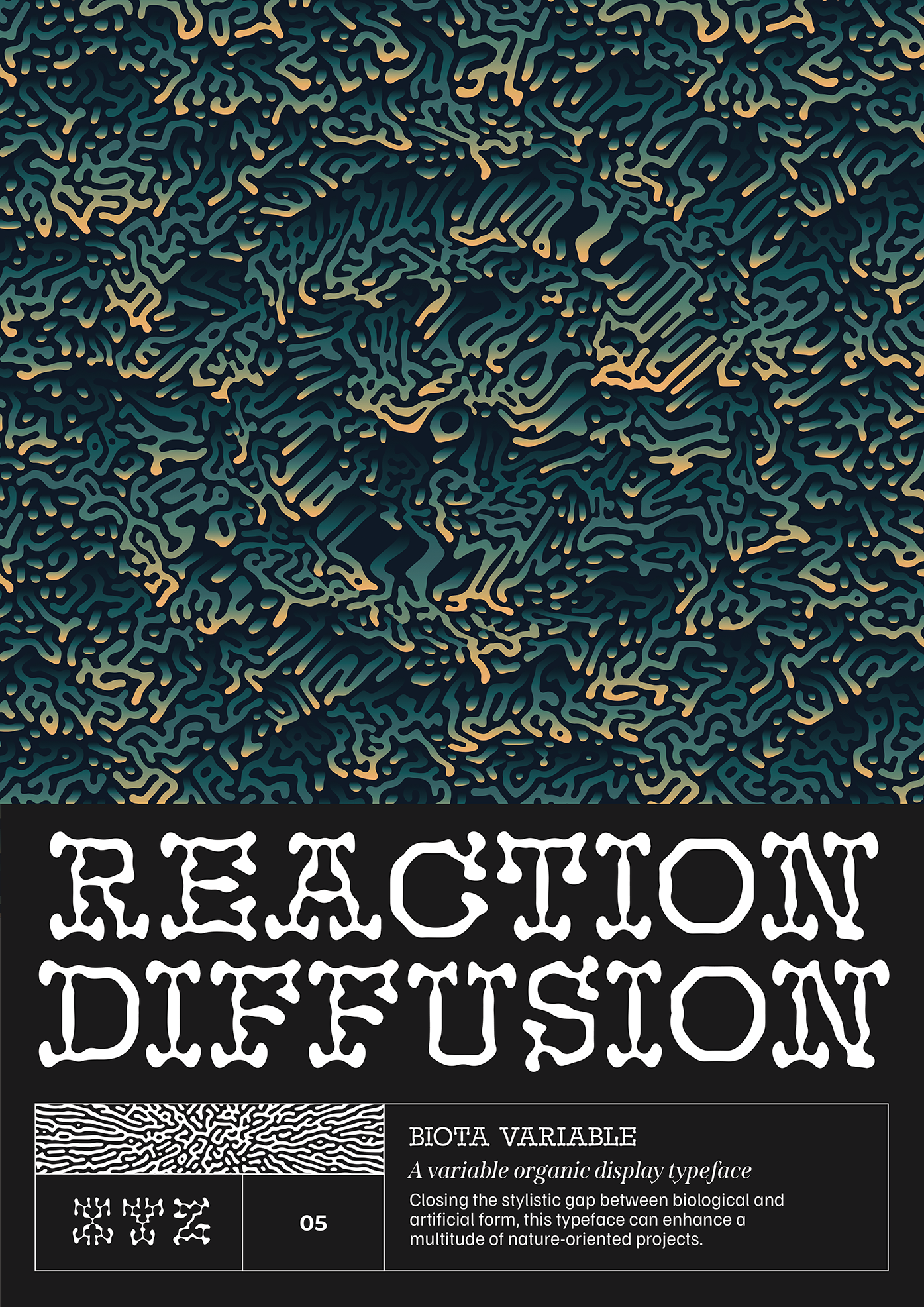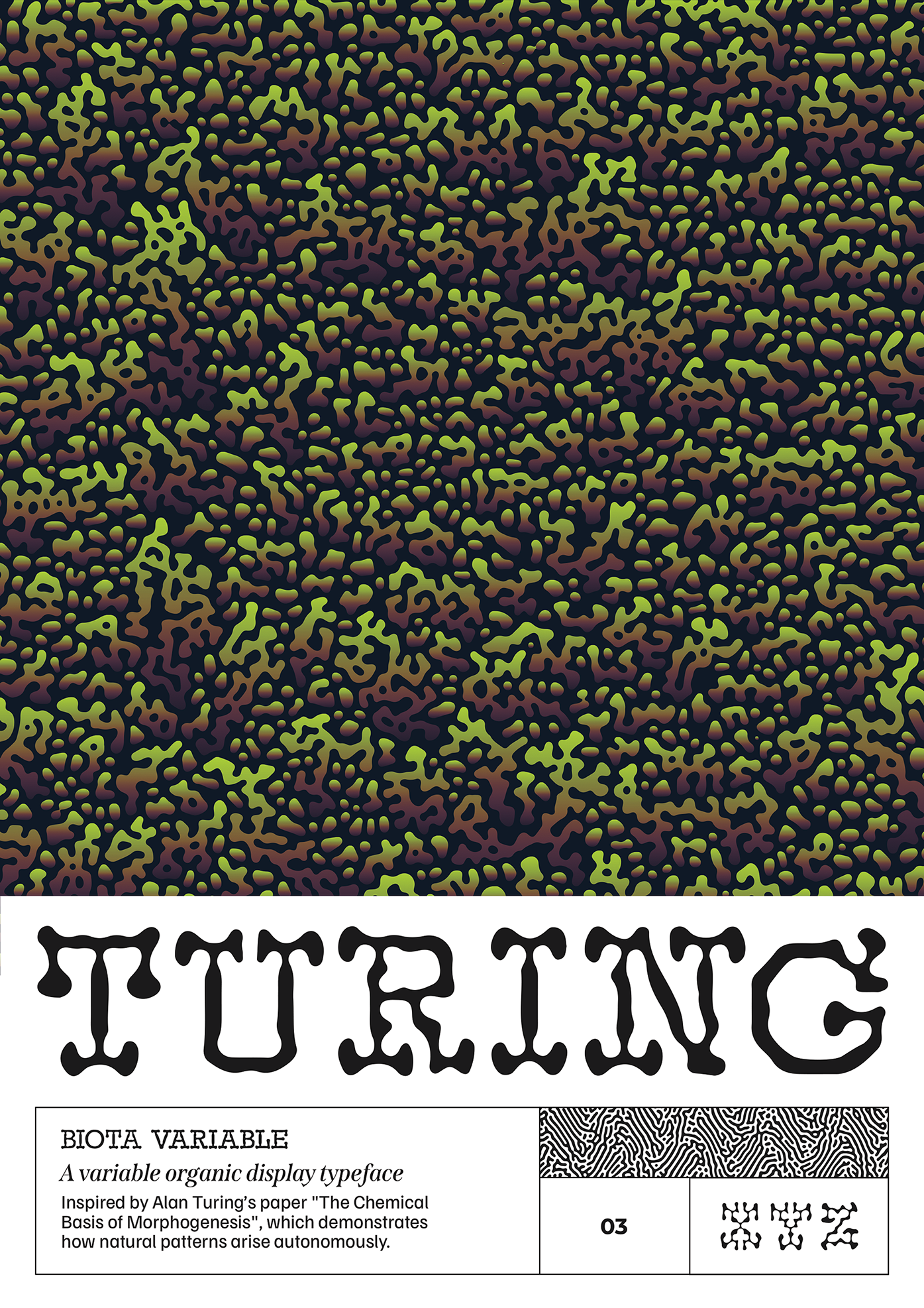 This project was developed as my response to the ISTD 2024 brief 'The Line', which invited participants to explore the concept of lines through typographic design. My interpretation, titled 'Biota' is a variable typeface inspired by reaction-diffusion patterns found in nature, specifically the organic systems described in Alan Turing's paper 'The Chemical Basis of Morphogenesis'.