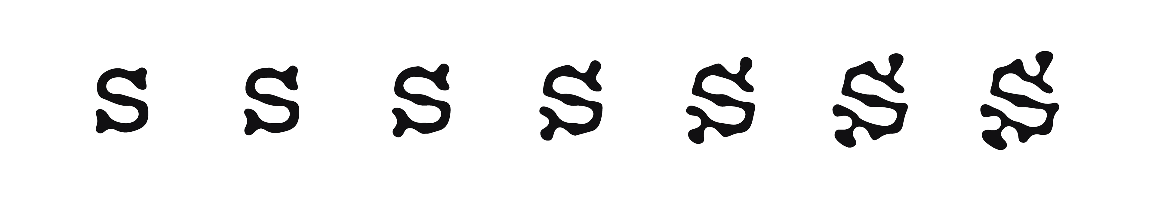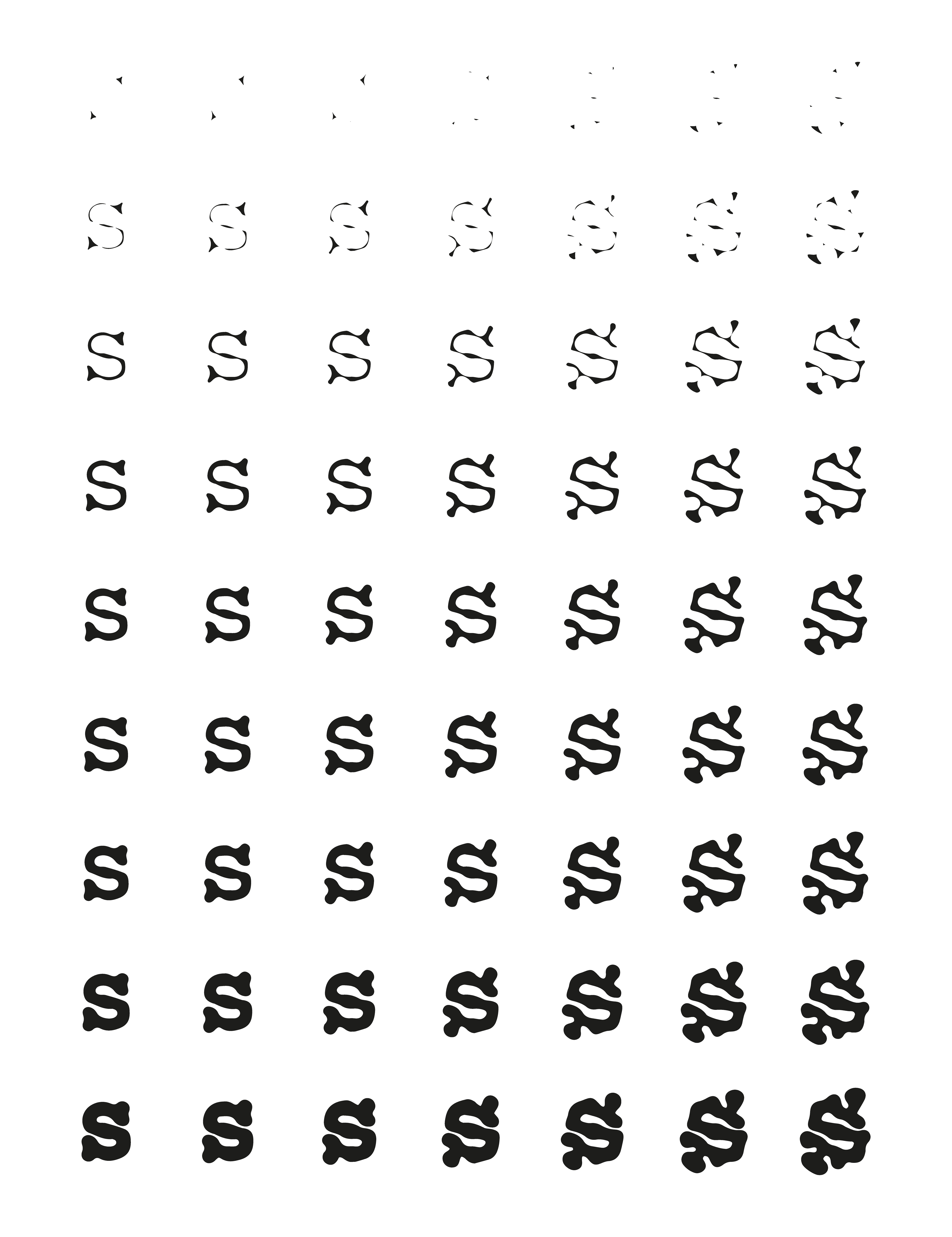 Seven style variations take the typeface from legible to distorted, branching out and filling the space in a balanced way that results in unique forms.