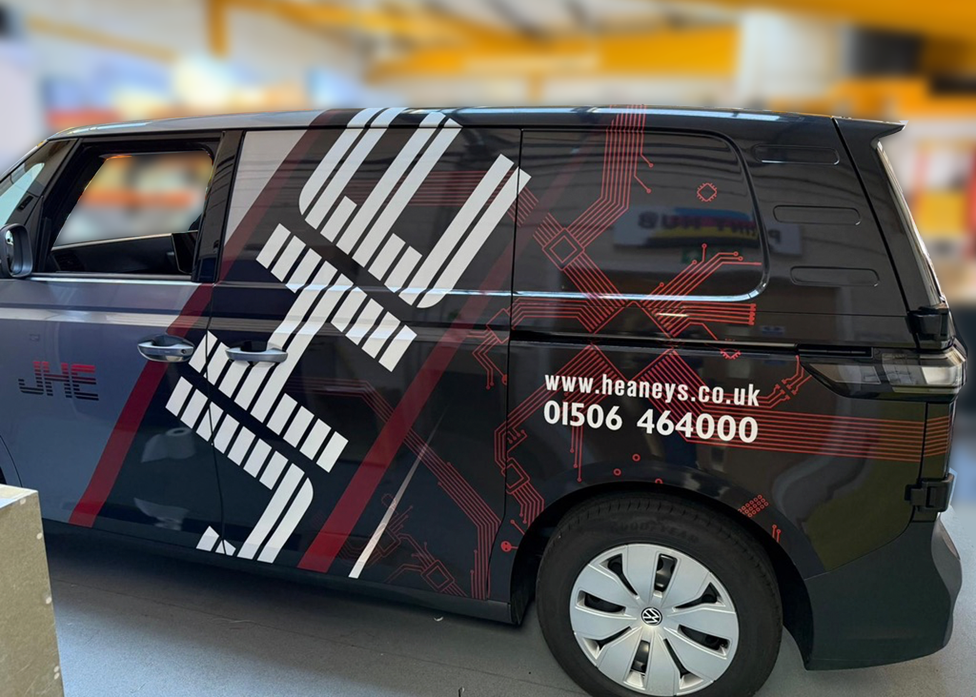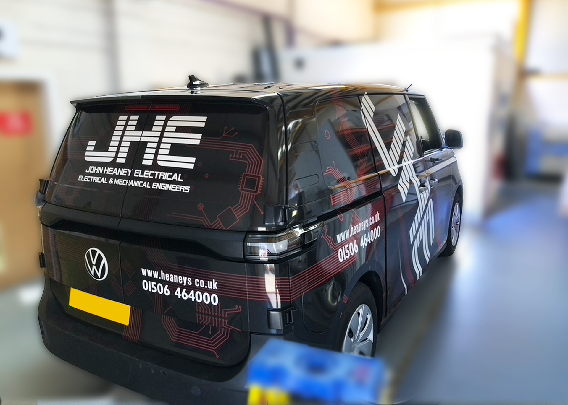 I designed a custom van livery for John Heaney Electrical, developing a seamless wrap across complex 3D surfaces from a selected design direction. This project involved translating a bold visual identity into a full-vehicle wrap for the distinctive shape of the VW BUZZ.