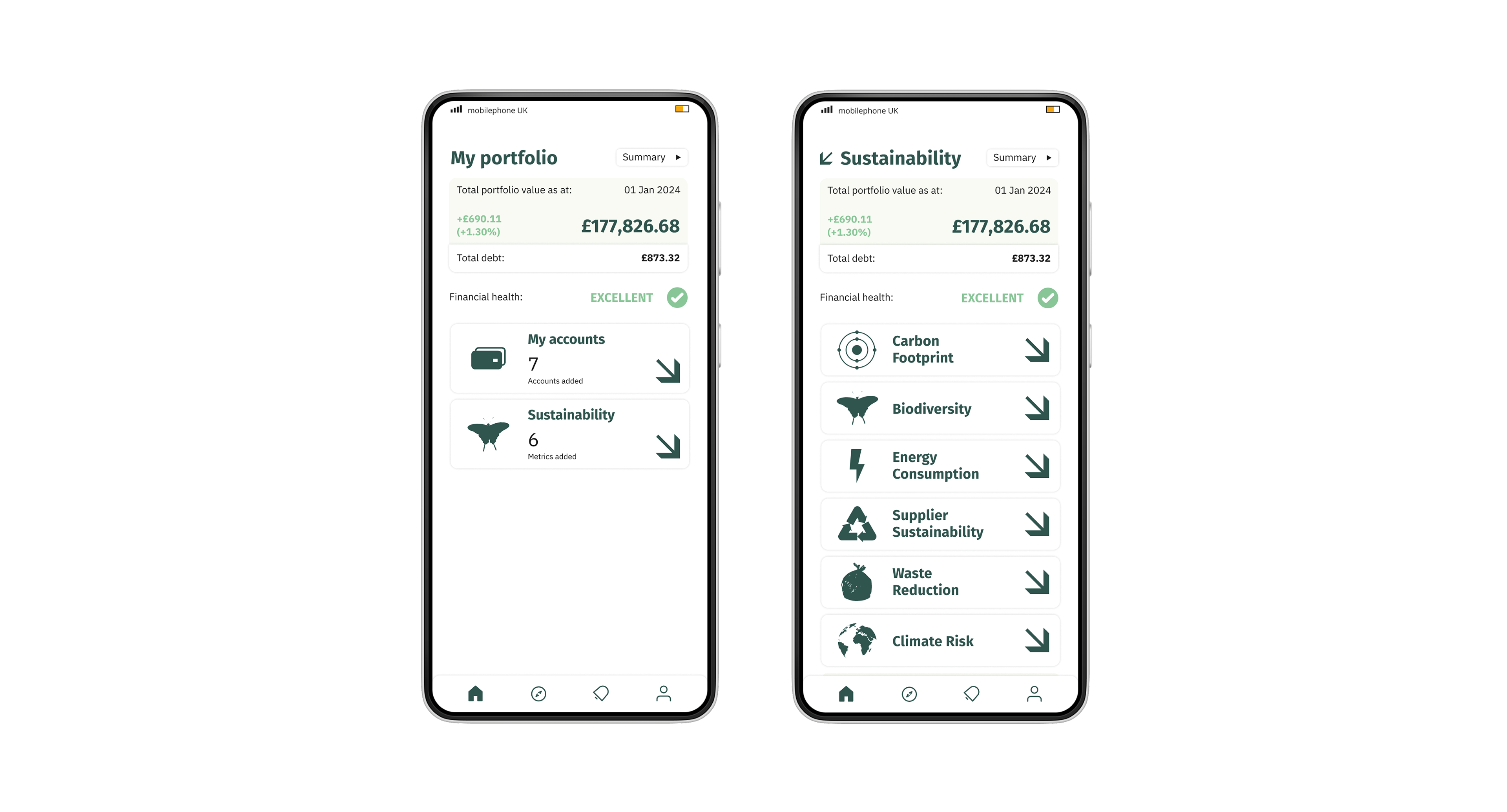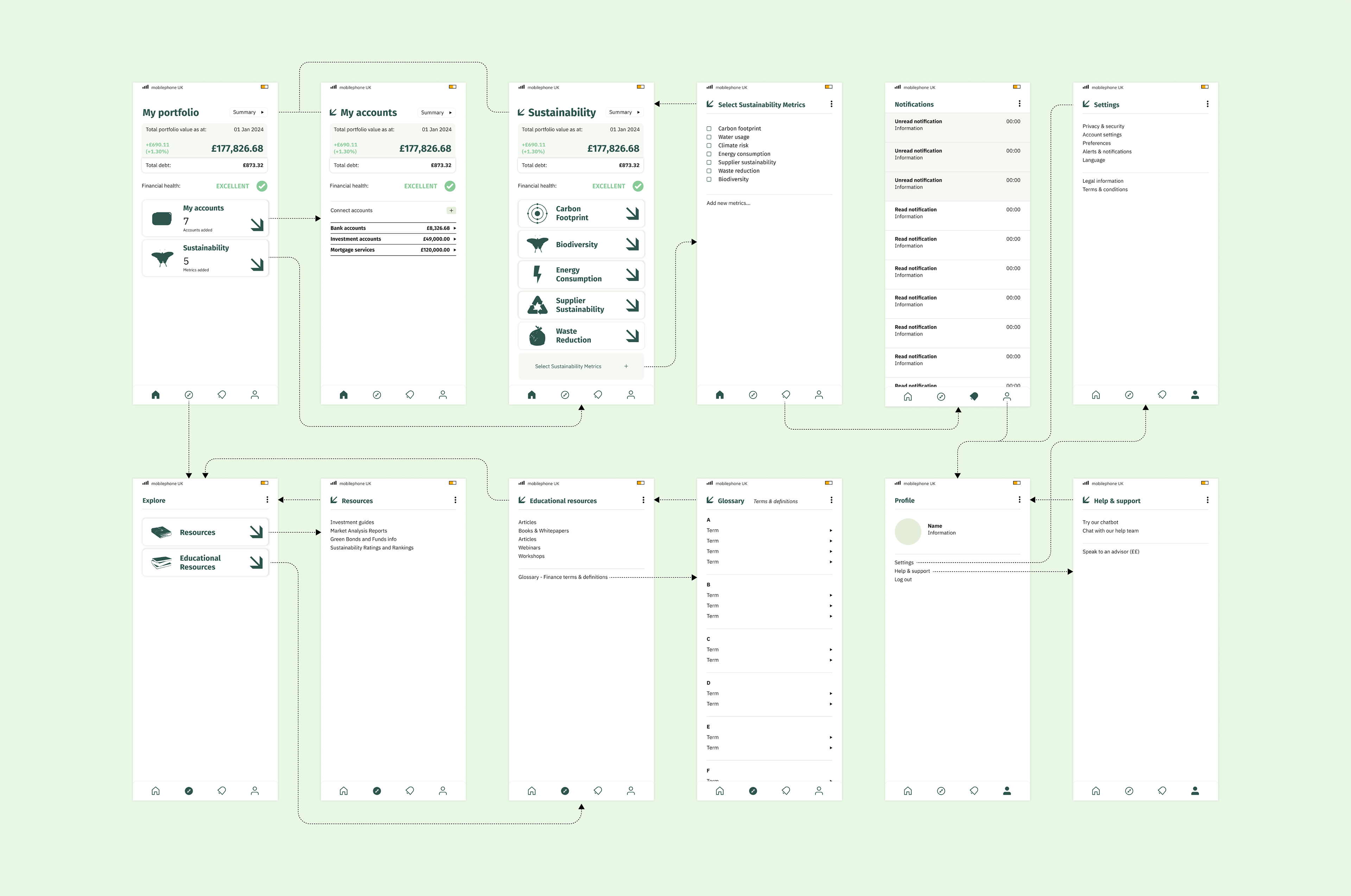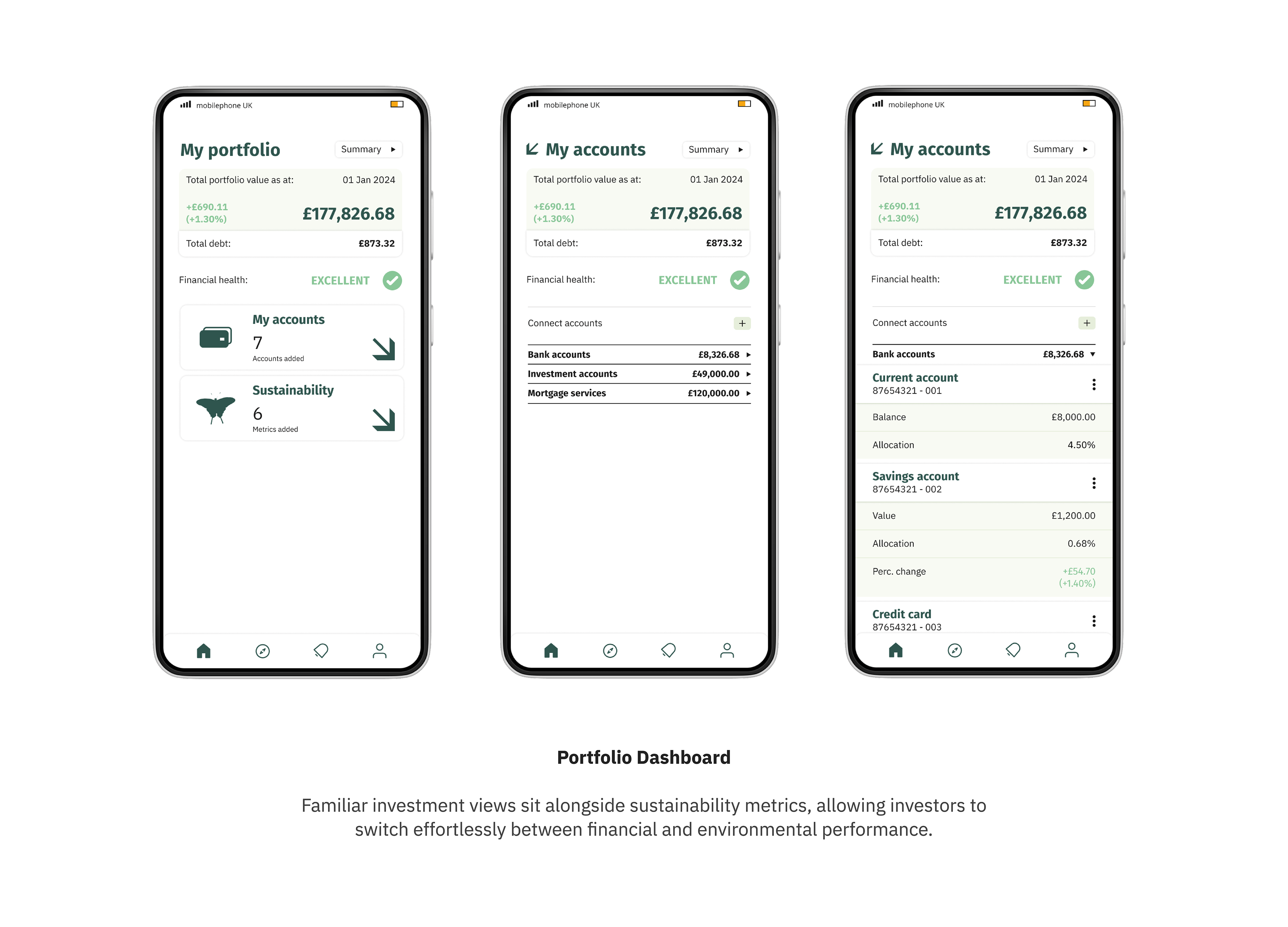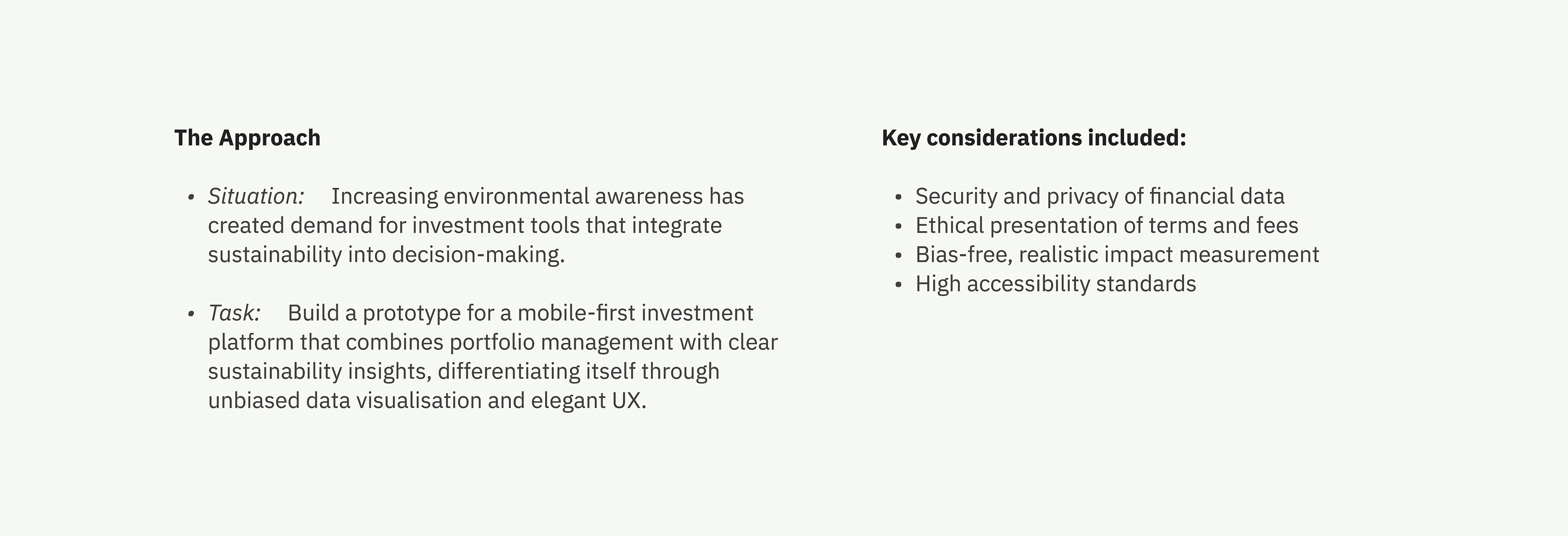 UI prototype for a sustainable investing app that visualises impact and guides greener choices.